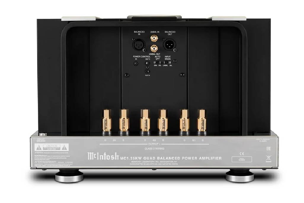 Mặt sau của MC1.25KW được bố trí 3 cặp cầu loa Solid Cinch độc quyền của McIntosh – Solid Cinch được thiết kế cho phép người dùng dễ dàng siết chặt hoặc tháo lỏng dây loa. Ở phiên bản này, McIntosh đã tăng khoảng cách giữa các cầu loa nhằm đáp ứng kết nối dễ dàng với các mẫu dây loa cồng kềnh